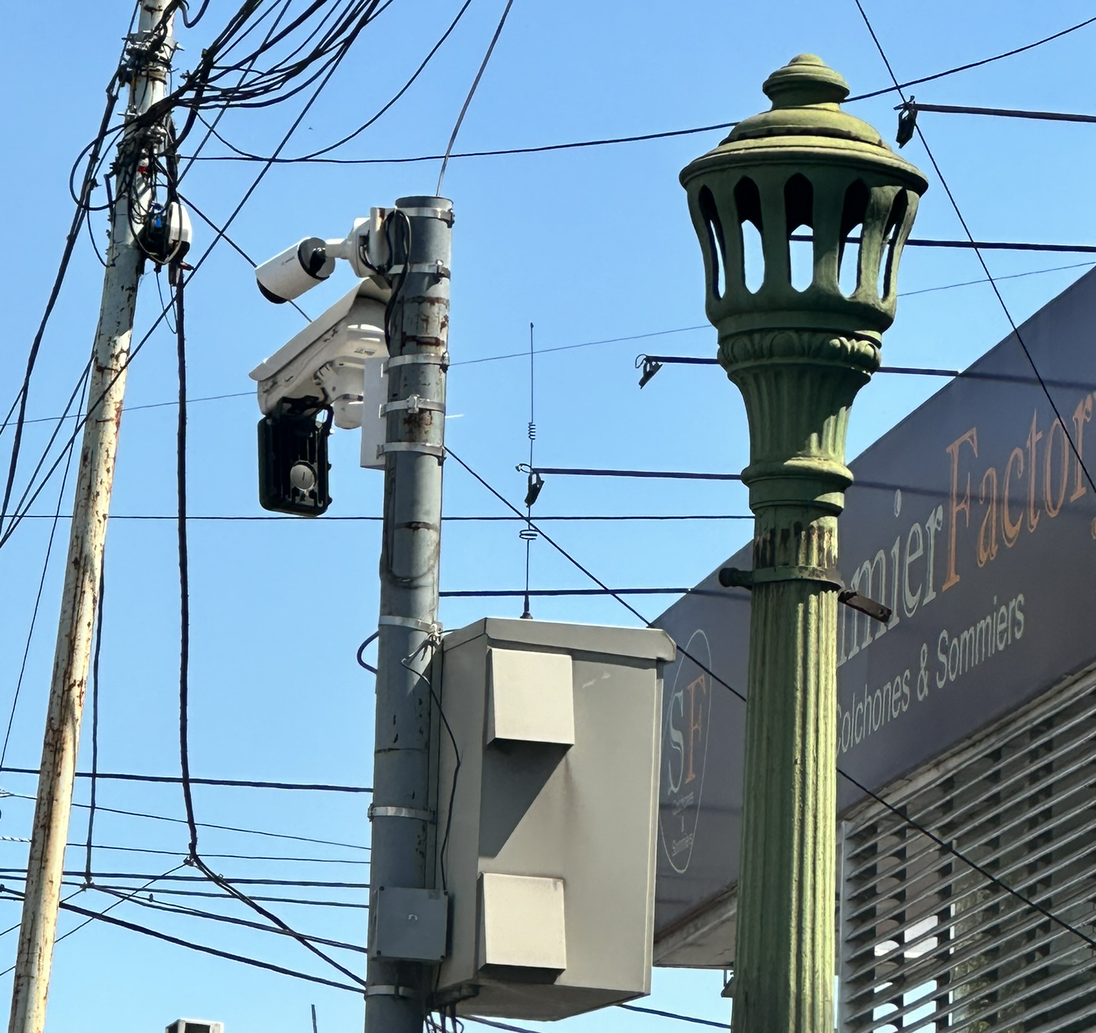 Freno en el semaforó y esta imagen captura de lleno mi atencion. El conjunto un respirador, camaras de seguridad y un caos de cables descomunal. El respirador que he visto en varias partes de la cuidad, Las cámaras estas mas complejas que otras, de seguridad etc Otras camaras usadas para detectar infractores. Y el caos de cables sobre cable, sin ninguna planificación previa, sin ningun orden o prevision, solo atendiendo a la necesidades de distintos tiempos, que poco le importó lo hecho previamente ni lo que vendría despues, el solo yo necesito poner este cable que ha desencadenado en casi un infierno digital Poderosa imagen que con poco o mucha similitud me cerebro asocio a las estrofas de la biblia y el calefón.